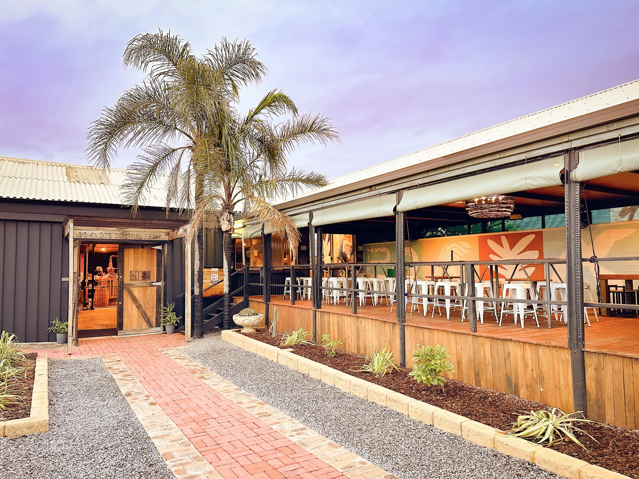 30 Knots Distillery is located at 166 Chapman Road, Beresford, Western Australia. Drawing on inspiration from the Geraldton region, Muz has given the existing building a new lease of life in line with our philosophy of reuse, repurpose, recycle and reimagine. From jetty timbers, to scrap metal, bricks and pre-loved furniture, we’ve strived to be as sustainable as possible when creating the space.