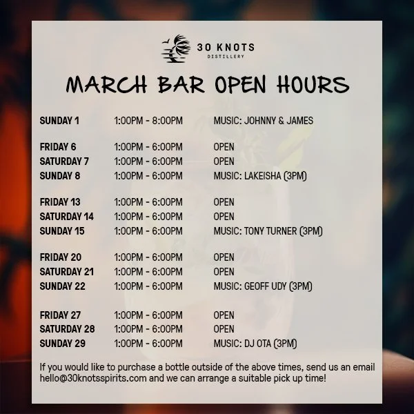 Walk-ins welcome. For large bookings please email hello@30knotsspirits.com.
